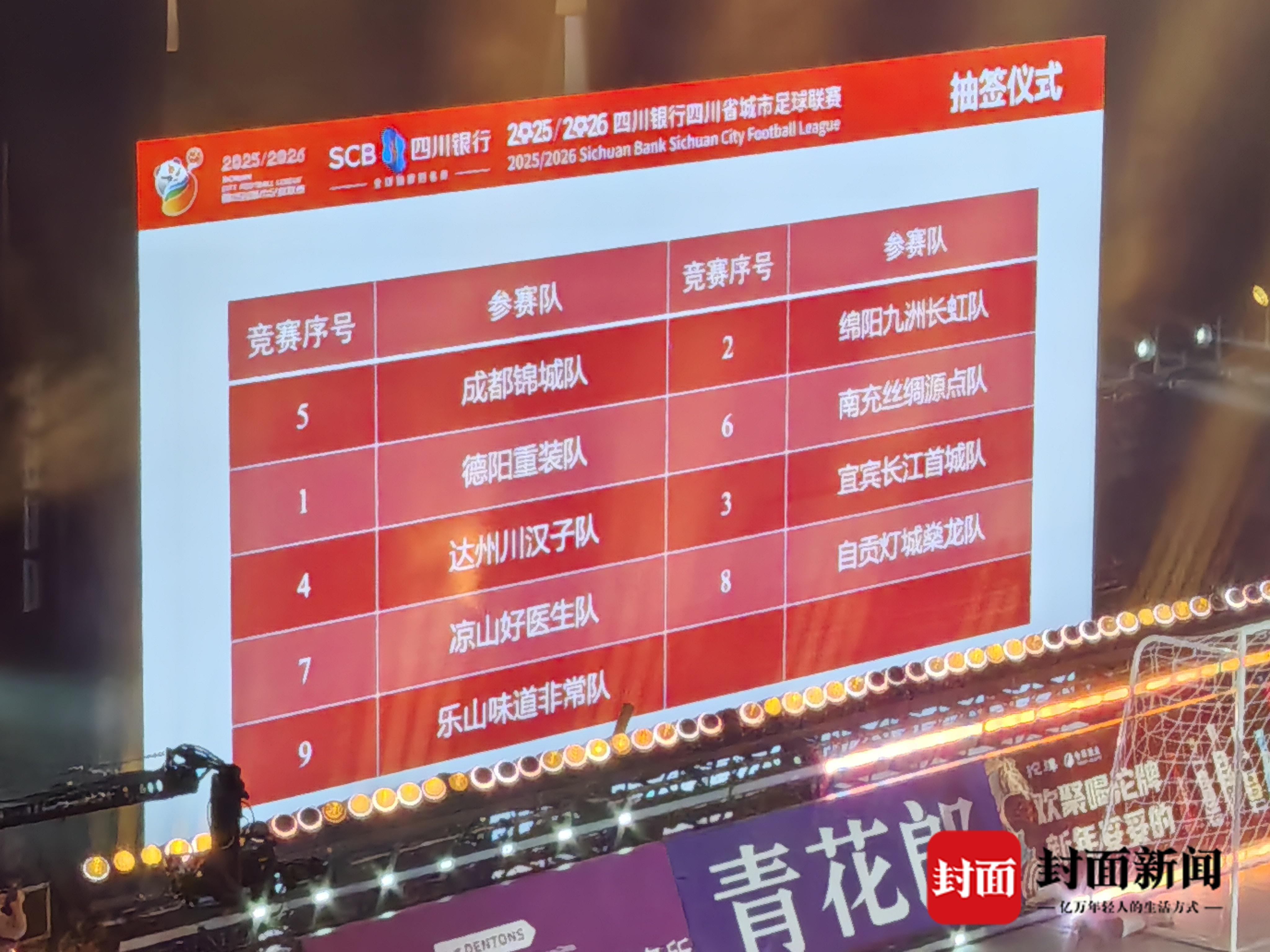 按照抽签结果,德阳重装队1号位,绵阳九洲长虹队2号位,宜宾长江首城队3号位,达州川汉子队4号位,成都锦城队5号位,南充丝绸源点队6号位,凉山好医生队7号位,自贡灯城燊龙队8号位,乐山味道非常队9号位。