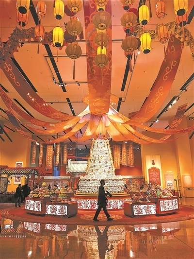 中国工艺美术馆·中国非物质文化遗产馆的“过年——丙午春节系列主题展”,则以“历序时新”“骥跃鸿途”“食为天”“光转春辉”四大展区,构建多层次过年场景。“骥跃鸿途”展区内,剪纸、皮影、陶瓷、竹编等百余项非遗作品聚焦马元素,俊朗神姿与吉祥寓意兼具;“食为天”展区中,高4.5米、直径3.6米的非遗花馍“大鼓枣山”令人惊叹,这件由陕西18位匠人耗时一个月制作的作品,以大鼓为基、枣山为魂,融入龙凤花卉元素,尽显非遗美食的匠心。而“光转春辉”展区的近百件非遗灯彩,从荷花灯到龙凤宫灯,营造出万家团圆的璀璨氛围,成为观众的热门打卡点。