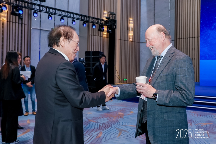 2013年诺贝尔化学奖得主迈克尔·莱维特在2025世界顶尖科学家论坛上同与会者交谈。(文汇报记者 邢千里摄)