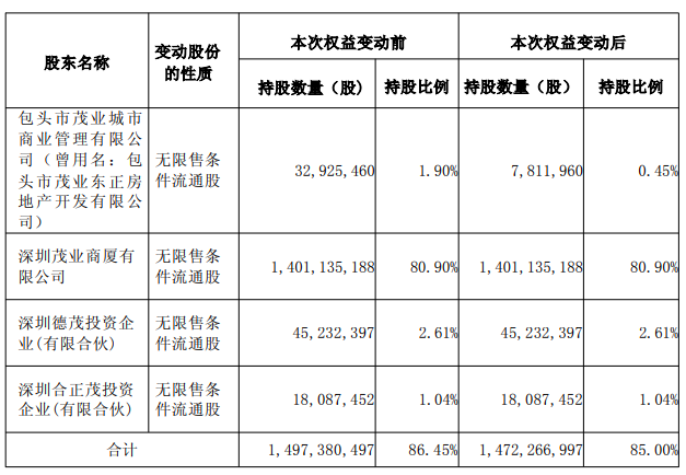 12月1日晚间,茂业商业(600828)公告披露,公司控股股东一致行动人包头市茂业城市商业管理有限公司(曾用名:包头市茂业东正房地产开发有限公司,以下简称“包头茂业商管”)于2025年11月28日至12月1日通过集中竞价及大宗交易方式减持公司股份合计2511.35万股,占公司总股本的1.45%。本次权益变动后,包头茂业商管及其一致行动人合计持有公司股份14.72亿股,占公司总股本的85.00%,仍保持绝对控股地位。