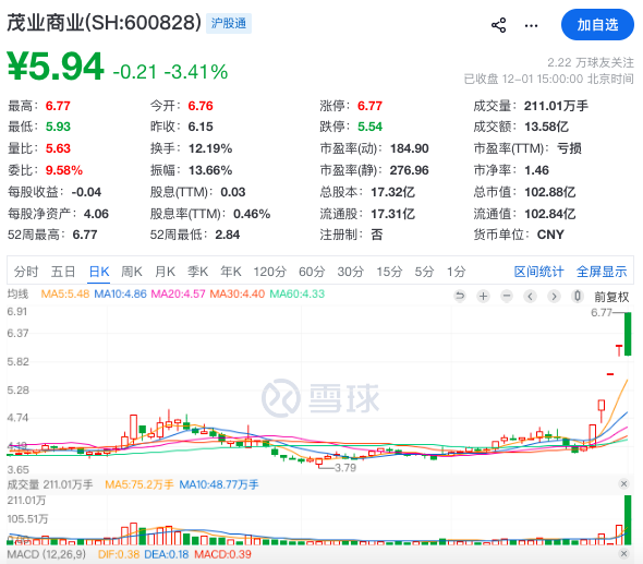 12月1日早盘,茂业商业(600828)9时31分即封住涨停,这是该股自11月25日起连续5个交易日涨停,股价创近三年新高。但该股上午盘中打开涨停板,截至收盘跌3.41%报5.94元/股,5个交易日股价累计涨幅超过40%。