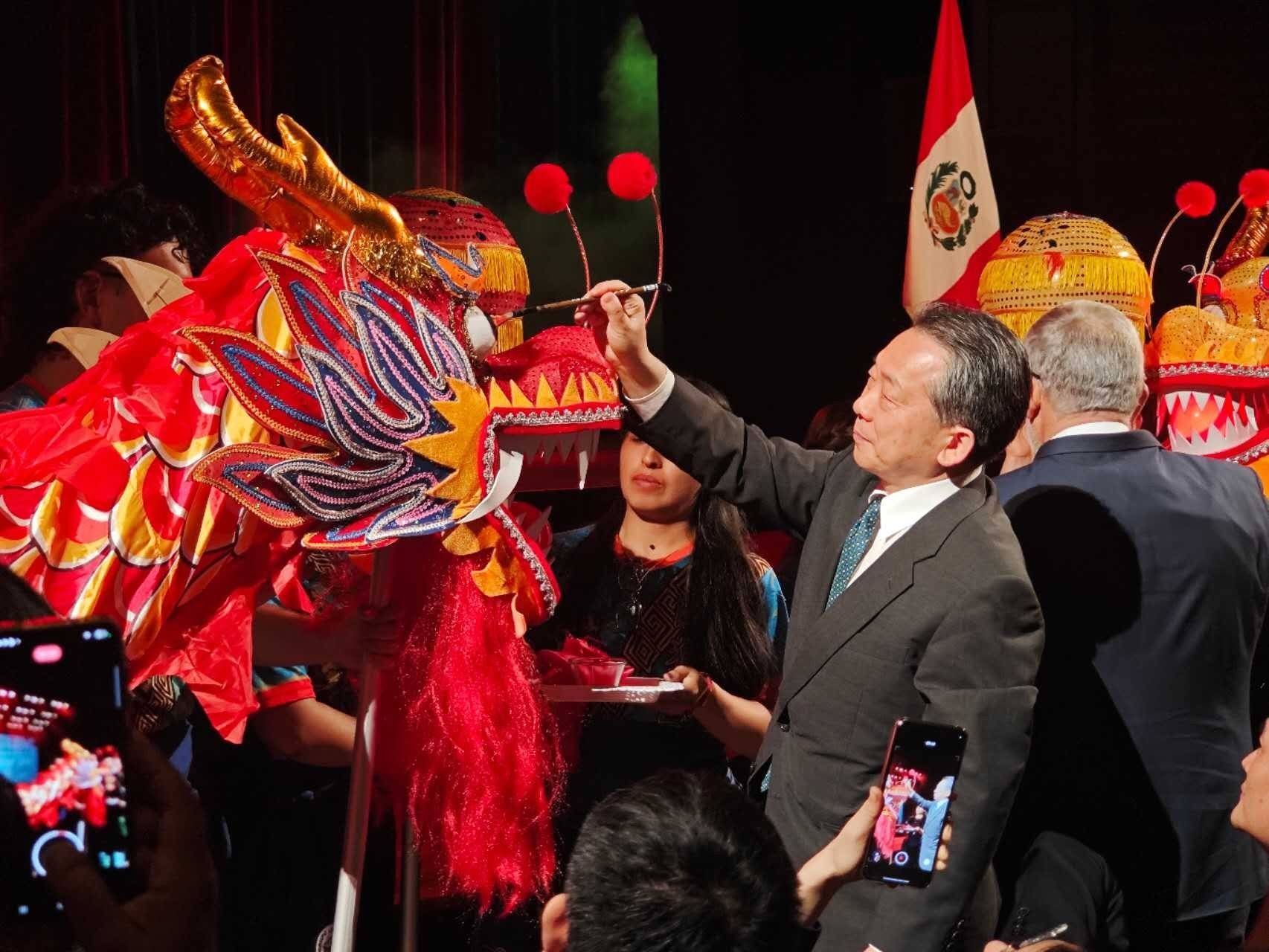 文艺晚会上,中国人民对外友好协会副会长袁敏道和秘鲁文化部部长阿尔弗雷多·布里塞尼奥共同为两条舞龙“点睛”。袁敏道表示,中秘文化互鉴、人民亲如一家的友好情谊早已在两国人民心中生根发芽,愿继续加强两国在文化艺术、教育、科研、旅游、青年等领域交流合作,同秘鲁各界携手共进,落实好两国元首重要共识,深化中秘全面战略伙伴关系,助力中秘友好之船扬帆远航。